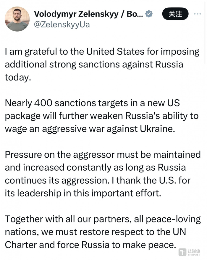 乌克兰总统泽连斯基周五发推文表示,此举将进一步削弱俄罗斯“对乌克兰发动侵略战争”的能力。“只要俄罗斯继续侵略,就必须保持并不断加大对侵略者的压力。”