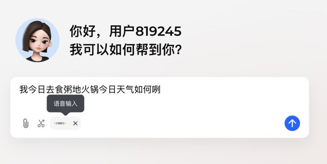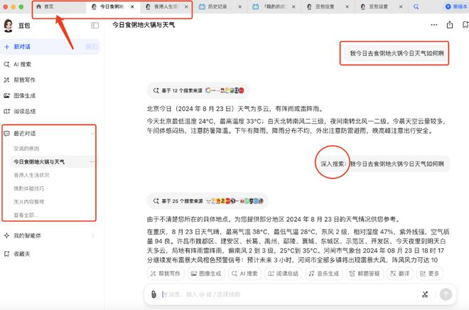 语言识别没有问题,豆包理解了“我想吃粥底火锅”,甚至提供了“北京哪里有好吃的粥底火锅?”的选择搜索项,但消息发送后跳转到了AI搜索的对话界面,且回复我的是文本而不是语音。