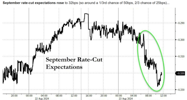 “鲍威尔周五在杰克逊霍尔会议上的鸽派语气并承诺‘竭尽全力支持强劲的劳动力市场’,意味着9月会议可能会讨论降息50个基点,此举可能需要8月份就业报告中的失业率进一步上升。”
