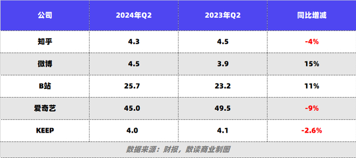知乎的付费会员收入比上一年同期下降了4%;B站的增值服务收入增长11%,但这部分业务包含直播。放大范围,爱奇艺二季度的会员收入45亿,同比下降9%;Keep的线上会员及付费内容4亿,同比下降2.6%。