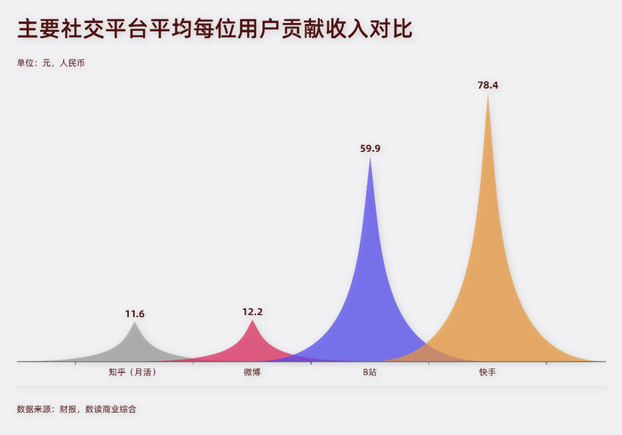 目前能够得到确切用户数据的只有快手、B站、微博、知乎四家,根据日活用户量和营收数据测算,B站每位活跃用户贡献60元营收,快手则高达78元,而微博只有12元。