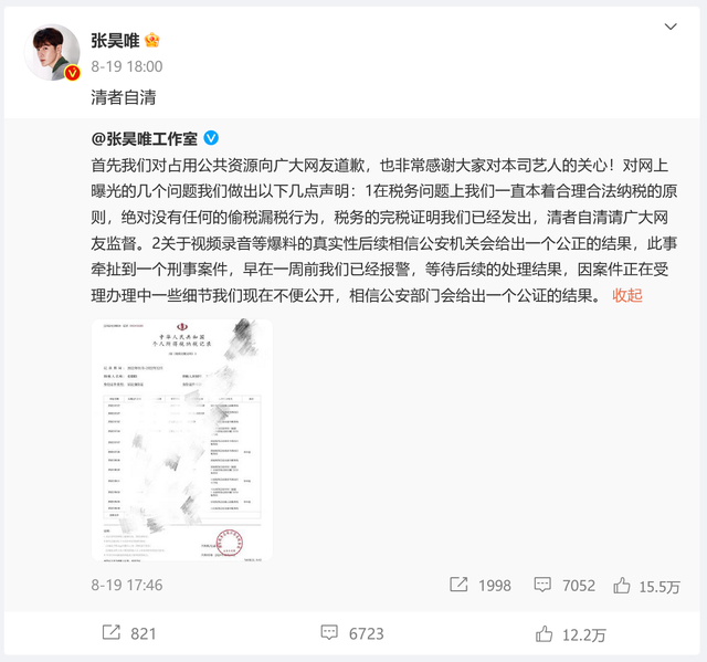 19日下午,张昊唯工作室发文表示:“绝对没有任何偷税漏税行为……此事牵扯到一个刑事案件,早在一周前我们已经报警,等待后续的处理结果,因案件正在受理办理中一些细节我们现在不便公开,相信公安部门会给出一个公正的结果。”配文是2022年纳税记录。