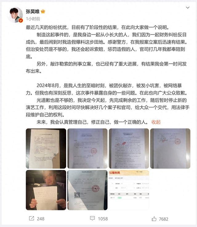张昊唯公开了立案书、调解书和无犯罪记录证明等,称制造这起事件的,是他身边一起从小长大的人,他们因为一起财务纠纷反目成仇,最后闹到对他造假爆料这步田地。同时,他表示将暂停演艺工作,解决好官司,给大众一个交代。