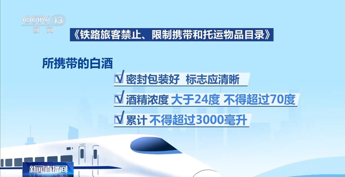 强烈刺激性气味食品和自热类食品的加热包不能携带上火车,除此之外,还有一种大家比较关注的物品,属于限制随身携带的物品,那就是白酒。关于白酒的携带,有哪些具体的规定呢?