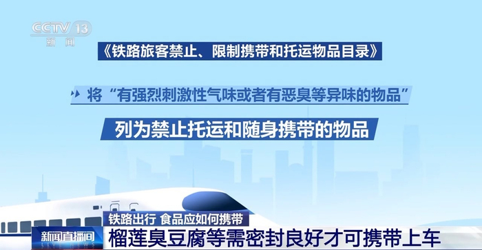 眼下,2024年暑运已进入尾声,随着各大院校陆续开学,铁路将迎来学生返校客流高峰。众所周知,乘坐火车出行,很多危险物品是不能携带的,比如枪支弹药、管制刀具、毒害品等等。不过您可能不知道的是,一些我们日常生活中十分常见的,看起来似乎没有什么安全风险的物品其实也无法带上列车,或者需要满足某些特定条件才能携带。就比如很多人都非常喜爱的榴莲、臭豆腐等具有刺激性气味的食品。