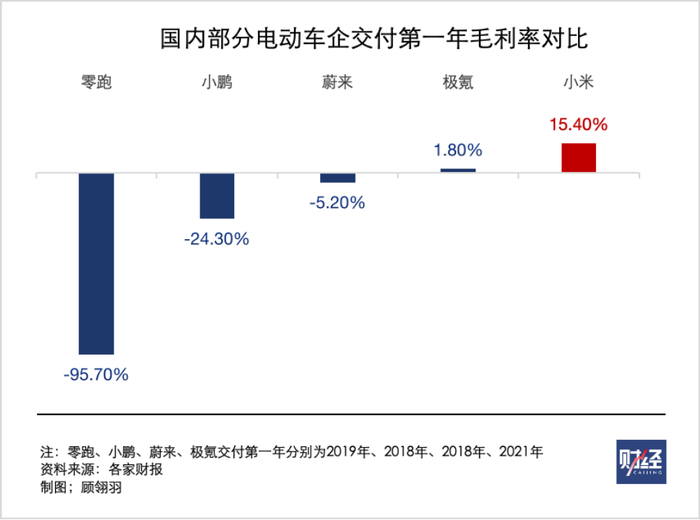 小米集团2024年二季度财报显示,小米汽车毛利率达到15.4%。这表明该公司汽车业务在该季度的运营中,每销售100元的商品,能有15.4元的毛利。汽车行业是典型的规模经济,随着交付量的增加通常可以降低成本,提高毛利率,而今年小米汽车刚刚开始交付,意味着毛利率还有继续提升的空间,对比其他纯电车企在首个交付年时的毛利率,小米断崖式领先。