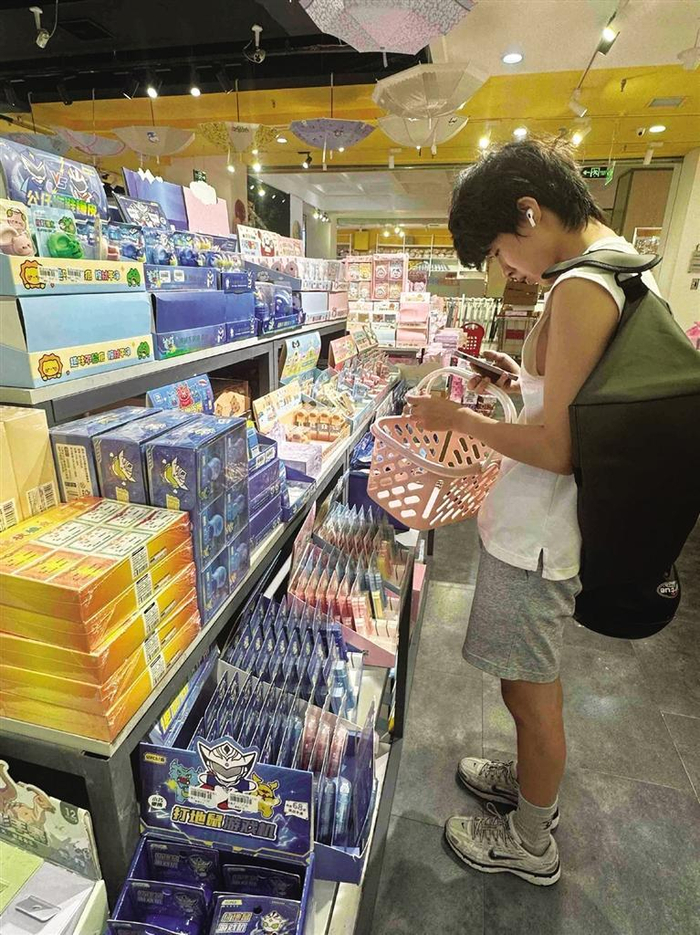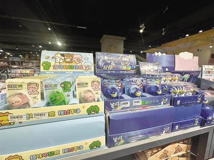 中国风、动漫潮、联名款……随着文具市场迭代升级,创新类文具深受学生的喜爱。走进华邦饰品城顶楼,综合类文创产品应有尽有,水杯、文具、玩具、生活用品等琳琅满目地分区排列,手账本、创意橡皮、三丽鸥系列文具格外吸引眼球。