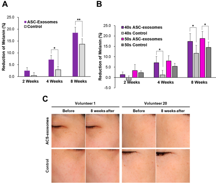 在首尔国立大学化学与生物工程学院开展的一项临床研究中“Skin Brightening Efficacy of Exosomes Derived from Human Adipose Tissue-Derived Stem/Stromal Cells: A Prospective, Split-Face, Randomized Placebo-Controlled Study”,脂肪间充质干细胞衍生的外泌体(ADSC-Exo)对色素过渡沉着的志愿者表现出亮肤效果。治疗4周后黑色素水平降低,未观察到不良反应。[9]
