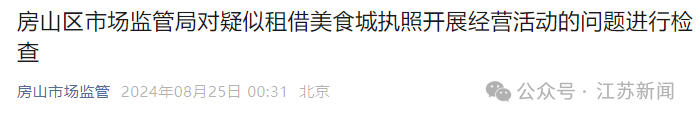 北京市房山区市场监督管理局表示,8月24日上午,针对媒体报道中反映的“没有证照可以去美食城租借执照”的相关问题,房山区市场监管局第一时间开展检查。