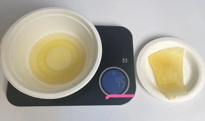 稍微戳两下,等纸上浸满了油后捞出来,再称,连碗带油就只剩 45 克了。也就是说,一张吸油纸吸走了 35 克的油脂。