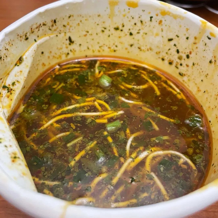 接着把吸油纸和抽纸都放入杯子里,按进汤里,充分吸收。等两边纸张都湿透、吸收得很饱满后,再捞出来。