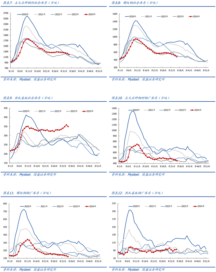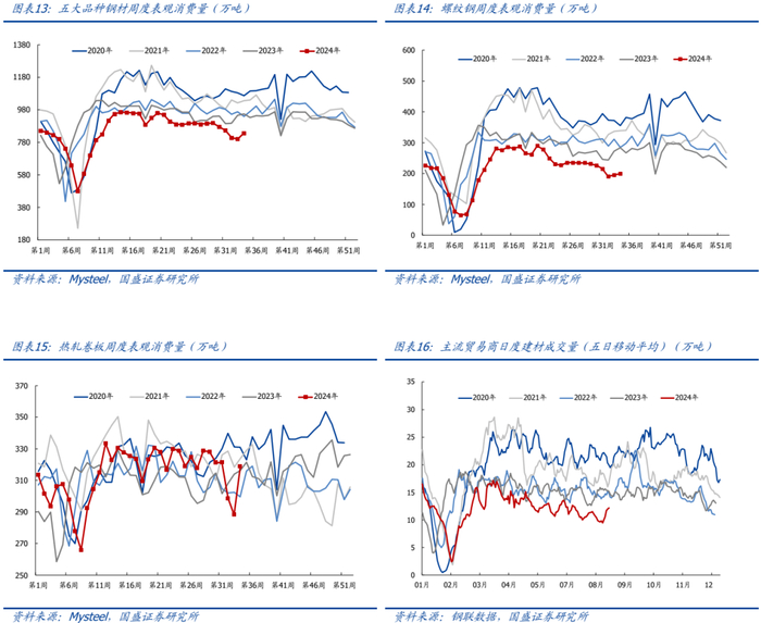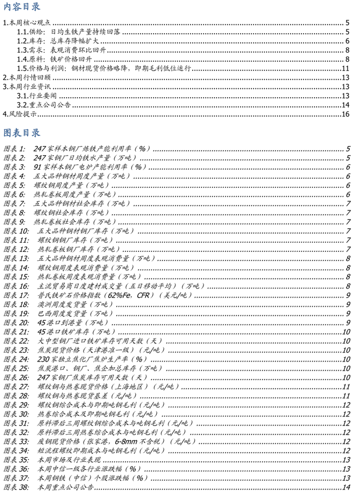 铁水产量持续回落,需求回暖迹象显现。本周全国高炉产能利用率、电炉产能利用率及钢材产量继续下行,国内247家钢厂高炉产能利用率为84.3%,环比-1.6pct,同比-7.5pct;91家电炉产能利用率为42.8%,环比-1.1pct,同比-13.1pct;五大品种钢材周产量为778.9万吨,环比+0.1%,同比-16.9%;本周长流程产量回落,日均铁水产量下降4.3万吨至224.4万吨,弱需求低利润背景下钢材产量小幅回升,热卷产出加快同时螺纹钢继续减量;库存方面,本周五大品种钢材周社会库存为1194.1万吨,环比-3.3%,同比-0.4%,钢厂库存为447.8万吨,环比-3.7%,同比+0.7%;钢材总库存持续回落,环比下降3.4%,降幅较上周扩大2.1pct,社库与厂库同步回落,建筑钢材去库速度加快;本周由产量与总库存数据汇总后的五大品种钢材周表观消费837.0万吨,环比+4.5%,同比-12.3%,其中螺纹钢周表观消费199.4万吨,环比+1.8%,同比-29.7%,本周五大品种钢材表需结束了连续四周的下跌,淡季或接近尾声,供需矛盾缓和,螺纹钢与热卷需求同步好转,建筑钢材周成交量为12.2万吨,环比+28.6%;本周钢材现货价格冲高回落,主流钢材品种即期毛利小幅改善,247家钢厂盈利率收窄至1.29%,环比-3.5pct。