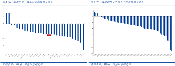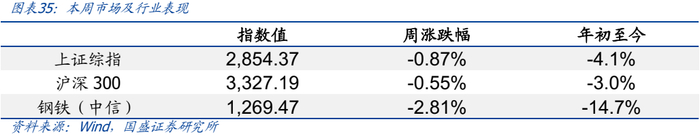 本周上证指数报收2854.37点,下跌0.87%,沪深300指数报收3327.19点,下跌0.55%。中信钢铁指数报收1269.47点,下跌2.81%,跑输沪深300指数2.26pct,位列30个中信一级板块涨跌幅榜第17位。