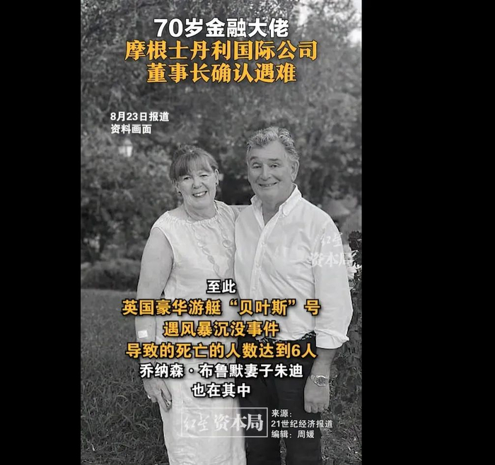 英国知名软件技术企业家迈克·林奇以及知名金融大佬、摩根士丹利国际公司董事长乔纳森·布卢默所乘游艇19日在意大利南部海域沉没。截至23日,7名遇难者身份已全部确认,林奇父女和布卢默夫妇在其中。