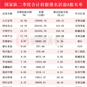 国家队二季度最新持仓动向曝光 合计持股排名居前A股名单来了