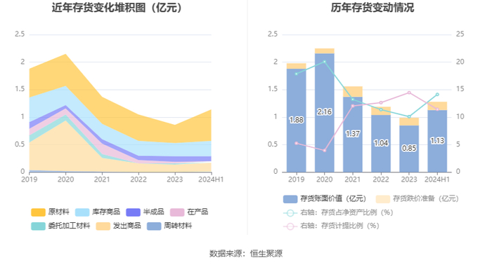 从存货变动来看,截至2024年上半年末,公司存货账面价值为1.13亿元,占净资产的14.13%,较上年末增加2782.79万元。其中,存货跌价准备为1459.09万元,计提比例为11.43%。