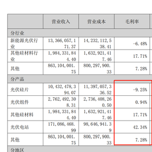 硅片业务毛利率为负是TCL中环盈利能力大幅下滑的主要原因。上半年,TCL中环的硅片业务实现营业收入104.32亿元,同比下滑61.31%,毛利率为-9.25%,同比下滑34.13个百分点,是唯一一项毛利率为负的主营产品。