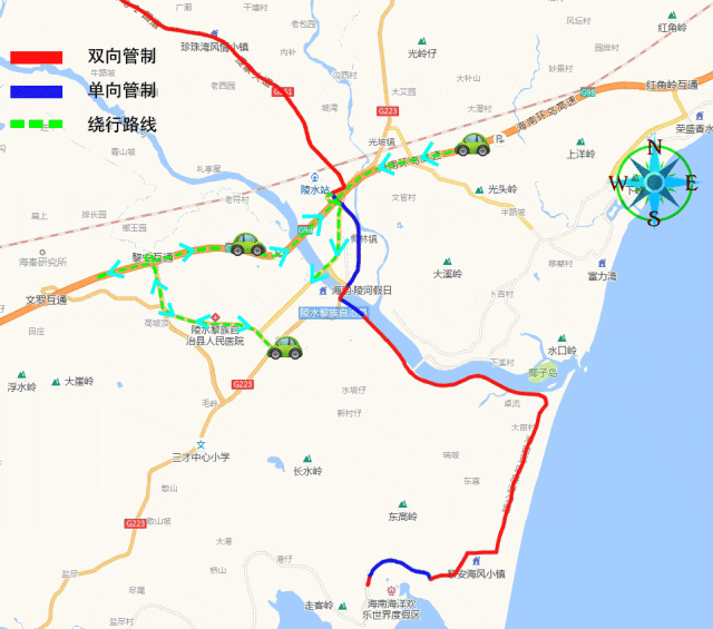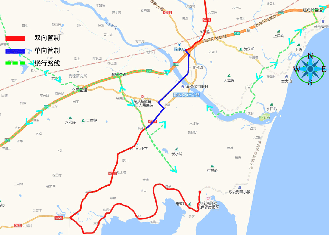 1.223国道陵水县与万宁市交界处——223国道与椰林北干道交叉环岛处(实行双向管制)