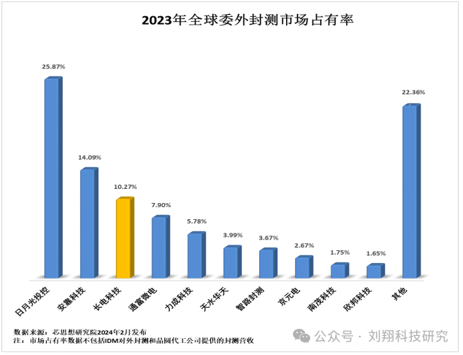 根据芯思想研究院(ChipInsights)发布的2023年全球委外封测(OSAT)榜单,长电科技以 预估294亿元营收在全球前十大OSAT厂商中排名第三,中国大陆第一。