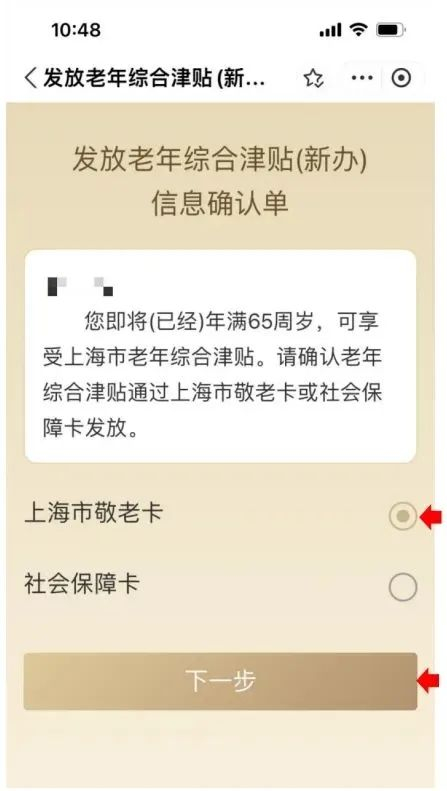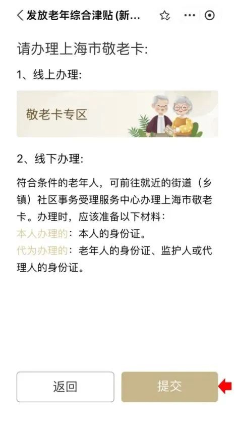 步骤三:根据页面提示线上或线下办理上海市敬老卡。(此步骤可以提交后再办理)