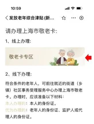 线上:老年人可以在“随申办”或“一网通办”中搜索并进入“发放老年综合津贴(新办)”事项,选择津贴通过敬老卡领取;