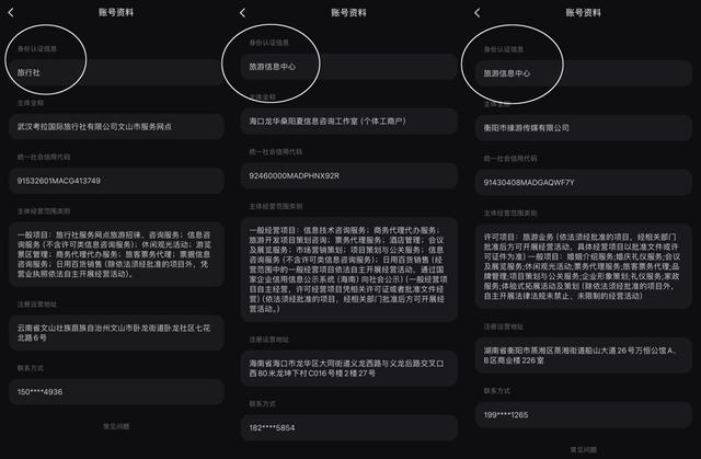 △图为小红书平台上引流账号的认证信息。大量外地个体工商户、传媒工作室在平台注册账号后并认证为“旅游信息中心”“旅行社”,进而发布引流帖。