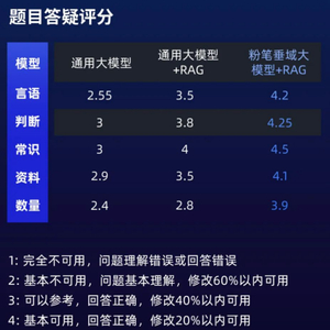从题目答疑场景中的各项评分来看,直接使用通用大模型,各项评分大多在3分以下,模型的回答可以参考,甚至基本不可用;而粉笔垂域大模型跟RAG(检索增强生成)结合后,