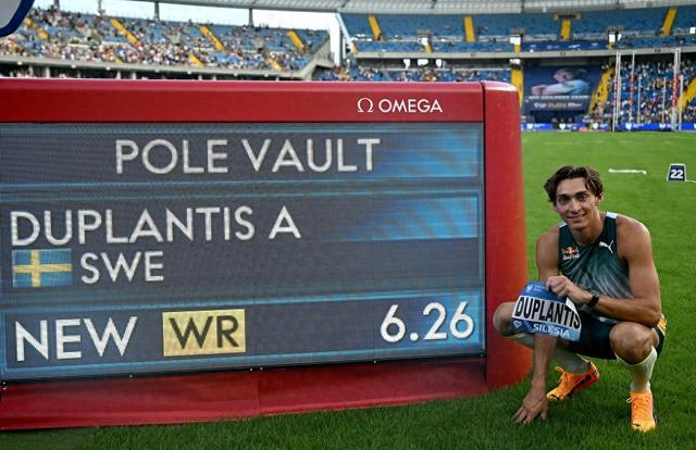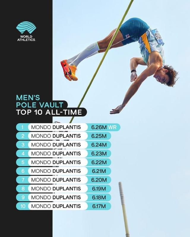 8月25日,世界田联钻石联赛西里西亚站在波兰举行,休假归来的瑞典撑杆跳高世界纪录保持者、巴黎奥运会金牌得主杜普兰蒂斯以6.26米再次打破世界纪录。根据数据统计,男子撑杆跳前十的成绩,全部由杜普兰蒂斯保持。