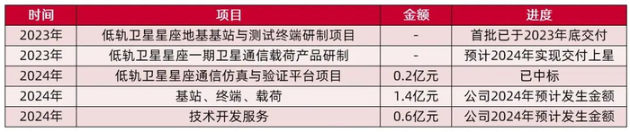 根据公司2023年年度报告披露,公司成功中标相关低轨卫星星座地基基站与测试终端研制项目,首批次产品已于2023年底顺利交付;中标入围低轨卫星星座一期卫星通信载荷产品研制,载荷预计于2024投产,配合相关星座2024年发射规划,实现交付上星。根据中国招投标网公示信息,2024年5月,公司全额中标垣信科技的2个低轨卫星星座通信仿真与验证平台项目,分别为“低轨卫星星座通信系统在轨验证平台”和“低轨卫星星座系统接入网系统仿真参数配置模块及协议模块开发”,中标金额分别为1776万元与246万元,合计2022万元。根据《上海瀚讯信息技术股份有限公司关于确认2023年度日常关联交易及2024年度日常关联交易预计的公告》,2024年公司与垣信科技拟交易金额约2亿元,其中,基站、终端、载荷相关产品约1.4亿元,技术开发服务约0.6亿元。