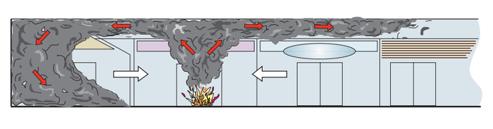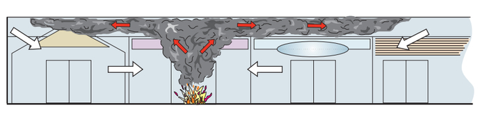 当建筑物内发生火灾的时候,炙热的烟雾会迅速上升,堆积在天花板周围。在没有阻隔的情况下,烟雾会沿着天花板快速扩散到整个建筑物内部,形成烟雾层。