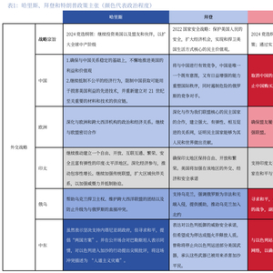 哈里斯短期内会继续延续这一外交策略。哈里斯方面暂时没有提出任何外交政策,预期短期内哈里斯还会继续执行这一框架,第一是因为2022年的国家安全战略已经较好的反应了民主党所认为的世界格局和外交政策理念。第二,依然两年过去了,世界格局尤其是中东地区几乎已经颠覆了民主党设想的该地区框架内的所有内容,但如果想系统的重新论证外交政策理论,哈里斯需要在明确获胜并组阁后进行,2022年的战略也是在拜登上任两年后才提出。