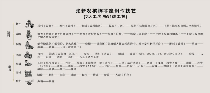 为践行“质为上”的家训和经营准则,张新发不仅坚持采购当季鲜果,在制作工艺上更是精益求精。作为非物质文化遗产的张新发槟榔制作技艺,分制料与制果两大部分,整个流程历经7大工序61道工艺。