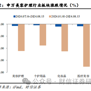 截至2024年8月15日,申万美容护理指数下跌19.82%,居申万31个一级子行业中第22位。