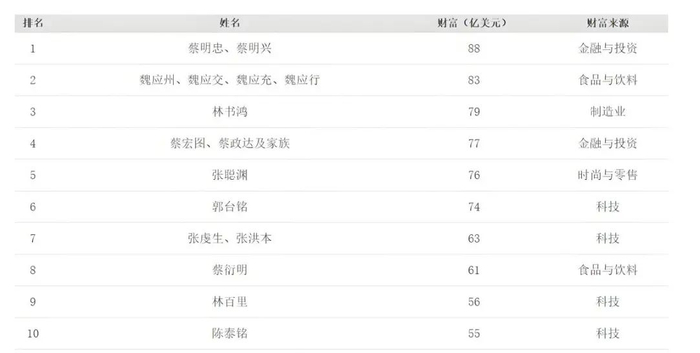 “中国台湾首富”蔡家,也是典型的“富过三代”。2023年,福布斯中国台湾富豪榜上,富邦金控的蔡明忠、蔡明兴兄弟,以88亿美元财富身家,夺得“中国台湾首富”宝座。这两兄弟就相差1岁,分别被称为“大董”“二董”。