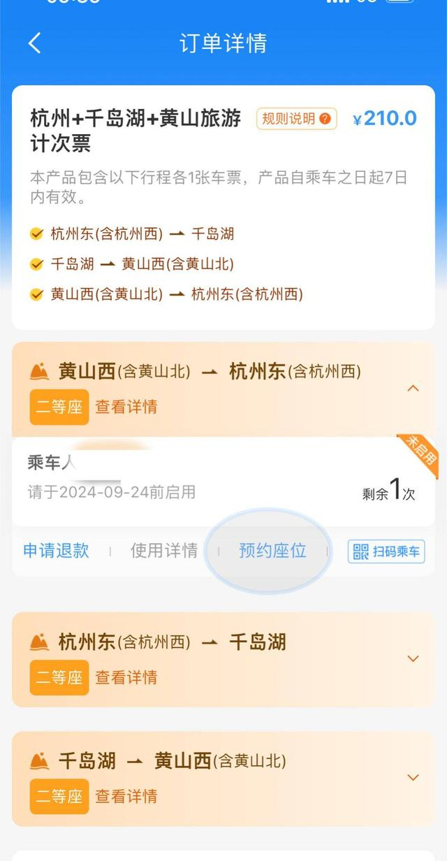 记者偿试购买了一套“杭州+千岛湖+黄山”的车票,系统提示凭这套车票,可以在30个内乘车,启动使用第一乘次后,其余2趟要在7天内用完。