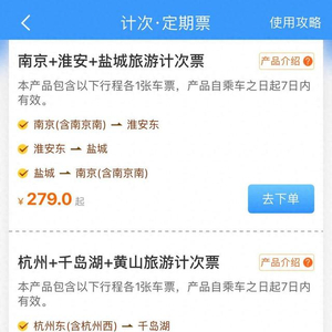 其中,“南京+淮安+盐城”包含南京—淮安、淮安—盐城、盐城—南京三张车票,二等座票价为279元。“杭州+千岛湖+黄山”包含杭州—千岛湖、千岛湖—黄山、黄山—杭州三张车票,二等座票价为210元。“上海+东台+扬州”包含的也是来回三张车票,二等座票价328元。