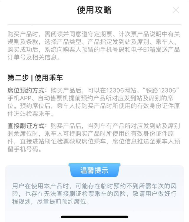 旅客持高铁旅游计次票不限定具体车次,可选择乘坐任意停靠相应区间的各等级动车组列车二等座。旅客购买产品后,30天内未乘车的,产品自动失效并全额退款。