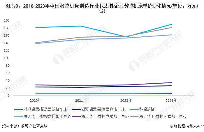 由于不同类型、不同等级的数控机床在生产过程中的功能和作用存在较大的差异,因此数控机床产品之间价格存在较大的差异。结合浙海德曼、科德数控、海天精工三家主要数控机床生产企业数据来看,2023年,浙海德曼普及型数控车床的价格有所下降,其余产品价格均有所上升。总体来说,随着生产的恢复、以及制造业转型升级步伐加快,对于数控机床等高端智能制造设备需求将持续增长;此外受全球环保政策影响及原材料供应紧张等多重因素影响下,在一定时期内数控机床部分原材料成本可能会进一步攀升,数控机床产品价格整体呈上升趋势。