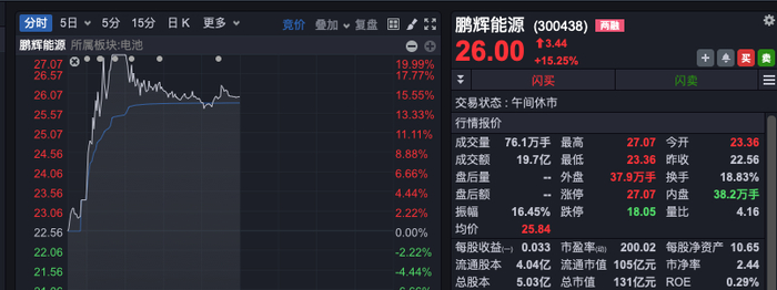 消息一出,鹏辉能源立马连续2个20cm涨停,今日再度触及涨停,4个交易日3度触板,最高合计大涨65%。