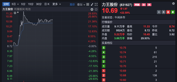 个股掀起涨停潮,力王股份一度触及30%涨停,天力锂能、鹏辉能源也均触及20%涨停,鹿山新材、东方锆业等逾10股涨停或涨超10%。