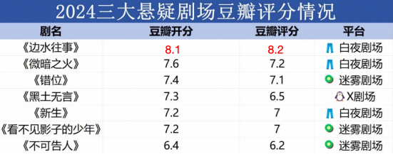 从豆瓣评分来看,优酷白夜剧场《边水往事》、《微暗之火》和《新生》分列今年悬疑剧豆瓣评分第一、第二和第五位,在Top5中占据三席,此外,爱奇艺迷雾剧场、腾讯视频X剧场分别占据一席。