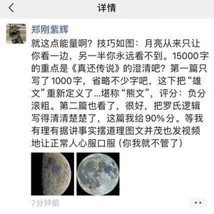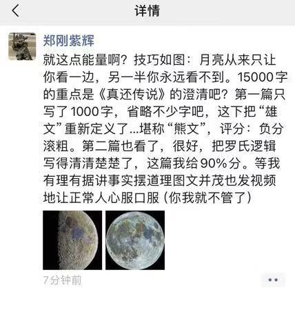 郑刚写道:“15000字的重点是《真还传说》的澄清吧?第一篇只写了1000字,省略不少字吧,这下把“雄文”重新定义了…堪称“熊文”,评分:负分滚粗。第二篇也看了,很好,把罗氏逻辑写得清清楚楚了,这篇我给90%分。等我有理有据讲事实摆道理图文并茂也发视频地让正常人心服口服(你我就不管了)”。