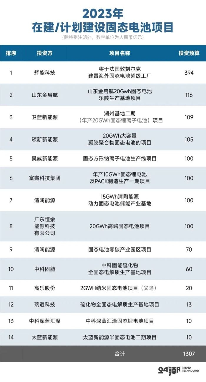 回到国内市场。据24潮产业研究院(TTIR)不完全统计,2023年仅国内企业至少对外公布了14个建设/计划建设固态电池领域重大项目,总投资预算超1300亿元。截至23年底国内(半)固态电池产能规划累计超298GWh,落地产能接近15GWh。