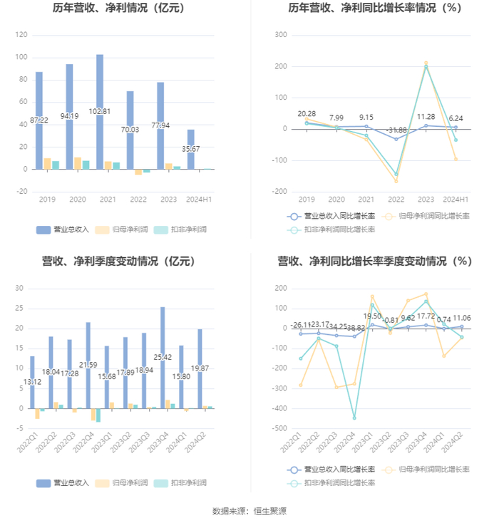 数据显示,2024年上半年公司加权平均净资产收益率为0.10%,较上年同期下降2.24个百分点;公司2024年上半年投入资本回报率为-0.48%,较上年同期下降2.16个百分点。