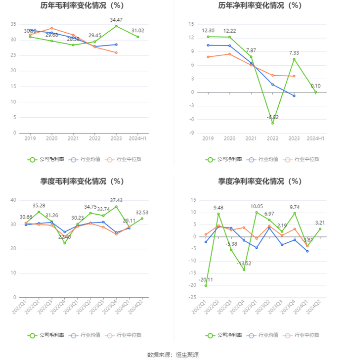 2024年上半年,公司毛利率为31.02%,同比下降1.62个百分点;净利率为0.10%,较上年同期下降8.31个百分点。从单季度指标来看,2024年第二季度公司毛利率为32.53%,同比下降2.22个百分点,环比上升3.42个百分点;净利率为3.21%,较上年同期下降3.76个百分点,较上一季度上升7.02个百分点。