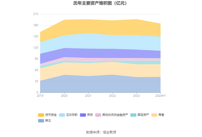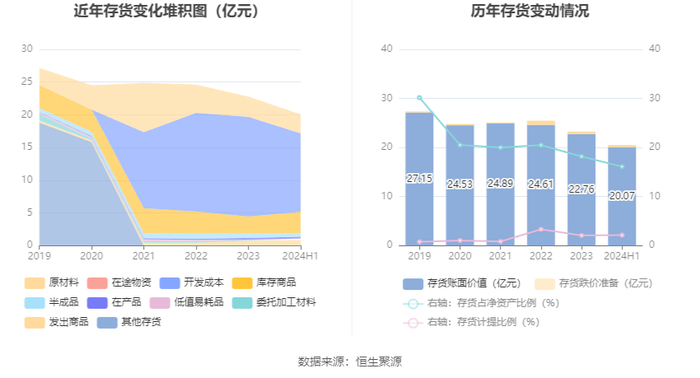 从存货变动来看,截至2024年上半年末,公司存货账面价值为20.07亿元,占净资产的16.1%,较上年末减少2.68亿元。其中,存货跌价准备为4390.97万元,计提比例为2.14%。