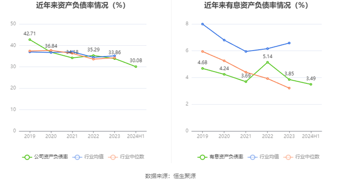 在偿债能力方面,公司2024年上半年末资产负债率为30.08%,相比上年末下降3.78个百分点;有息资产负债率为3.49%,相比上年末下降0.36个百分点。
