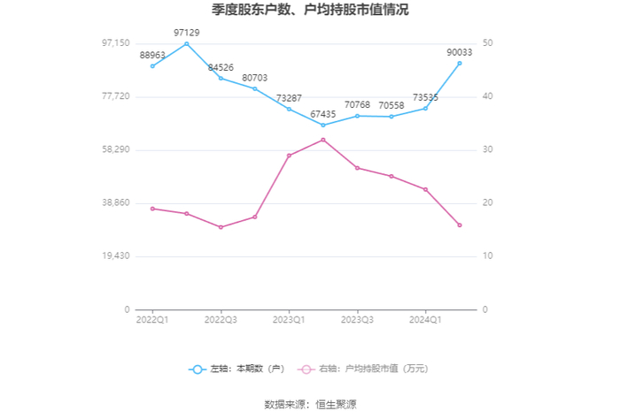筹码集中度方面,截至2024年上半年末,公司股东总户数为9万户,较一季度末增长了1.65万户,增幅22.44%;户均持股市值由一季度末的22.63万元下降至15.92万元,降幅为29.65%。