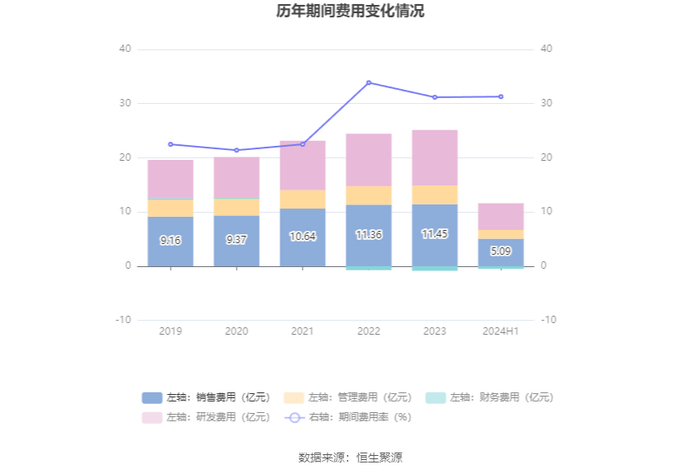 2024年上半年,公司期间费用为11.16亿元,较上年同期增加6527.66万元;但期间费用率为31.29%,较上年同期下降0.01个百分点。其中,销售费用同比下降0.92%,管理费用同比增长6.48%,研发费用同比增长6.2%,财务费用由去年同期的-7801.20万元变为-4655.85万元。