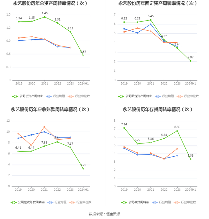 营运能力方面,2024年上半年,公司公司总资产周转率为0.57次,上年同期为0.48次(2023年上半年行业平均值为0.36次,公司位居同行业4/17);固定资产周转率为2.07次,上年同期为1.47次(2023年上半年行业平均值为1.81次,公司位居同行业10/17);公司应收账款周转率、存货周转率分别为3.25次、3.33次。